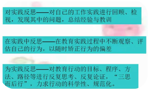 曾老师向我们提出:怎样选择有价值的故事?首先,故事的背后要有“含金量”。包含:教育智慧、教育艺术、教育哲理、教育规律…… 总之,故事的背后要有思想,寻找麻烦里的价值,从而突出教师的教育理念。她提出了3种反思方式:对实践反思——在实践中反思——为实践反思。