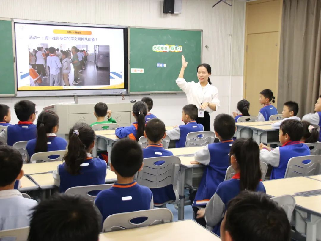 早上第一节课由泽雅镇第一小学翁嫦嫦老师和四(1)班的孩子们为各位老师带来精彩一课——《文明排队我先行》。课堂上,翁老师通过给孩子设定“小小监督员、小小评论员、小小礼仪员和小小践行者”四种不同的身份,让孩子们从“发现校园排队问题”,用上“看一看,说一说,想一想,做一做”的方法,想想文明招,填填活动单,悟出新方法,最后用自己的实践行动践行文明排队。