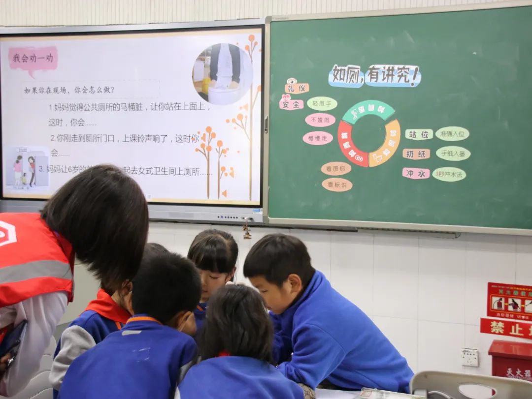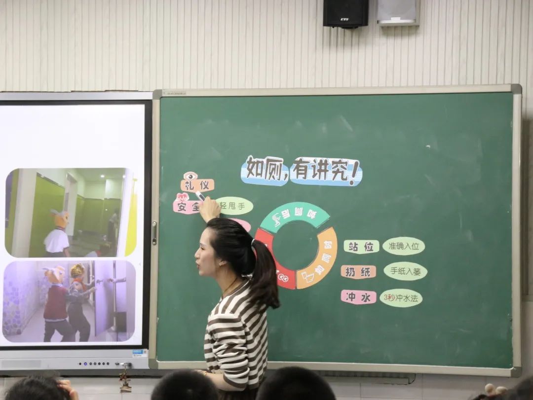 温州市城南小学胡建晓老师分享《凸显学生立场,盘活课堂活动》。“如厕有讲究”的课堂体验如何进行呢?胡老师的讲座分享了经验:班会课注重学生立场的活动体验!课堂以活动体验为主线,通过各种活动,让学生参与其中,让参与带动感受,从初磨的风平浪静,到再磨的微波粼粼,到最后呈现的一石千浪,让学生的认识到如厕文明是校园文明的重要表现,文明习惯会给人以"赏心悦目"之感,能调节人与人之间的关系,文明礼仪能使校园更加和谐。