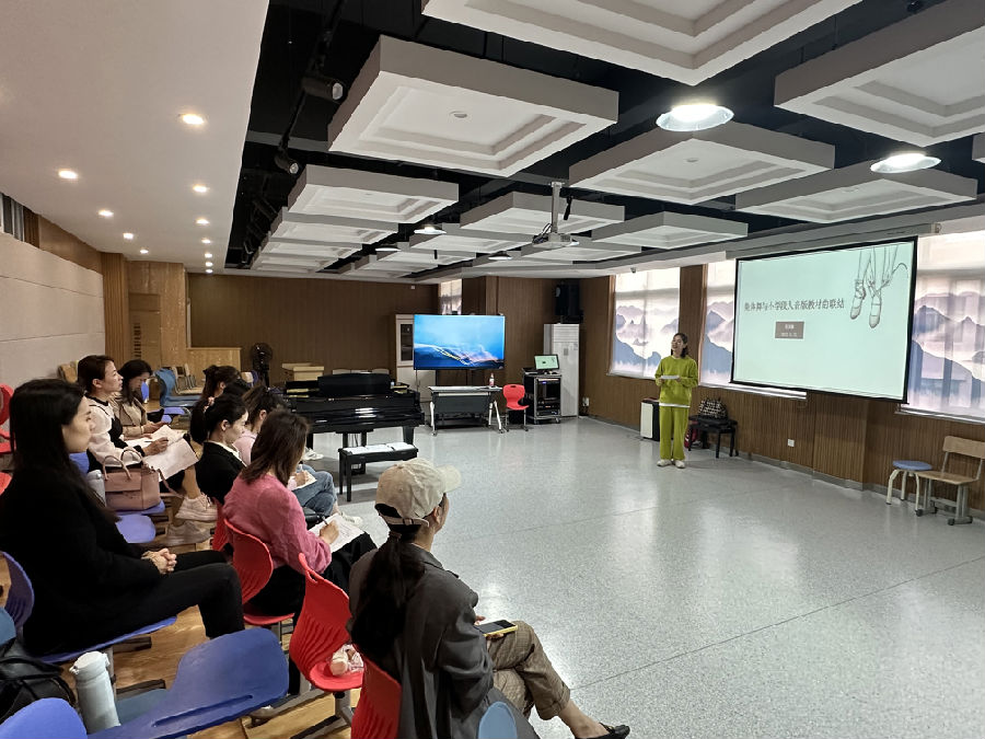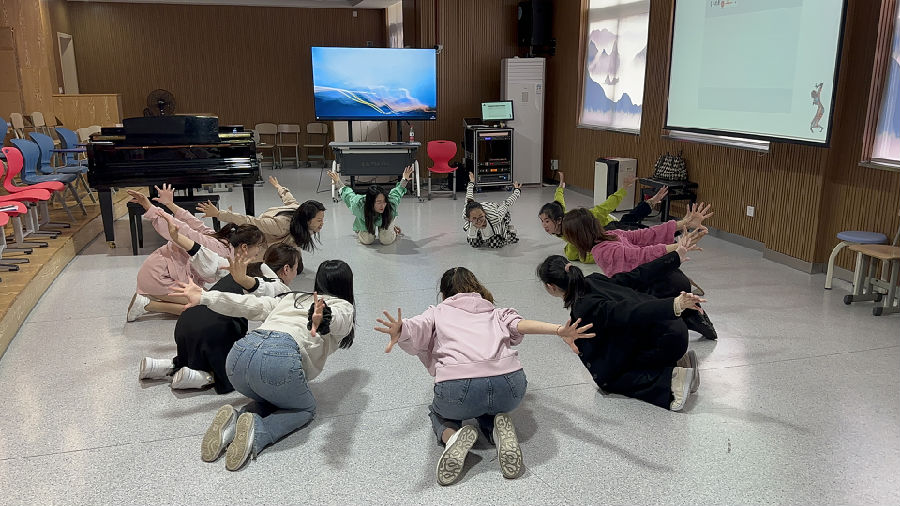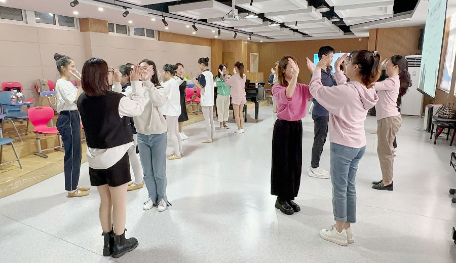 11月21日上午,在温州市艺术学校的合唱教室里,温州市教坛新秀、乐清市名教师黄颖颖老师正带着杨洲中小学舞蹈名师工作室的学员们和市舞协教育教学专委会成员们,热火朝天地进行音乐律动实践研修活动,黄老师以体验集体舞作为热身,引出什么叫集体舞,同时让老师们通过体验作品感受到集体舞不仅可以培养学生们的专注力、节奏感、空间感等,它还是学习音乐的桥梁。黄老师还结合人音版的教材,认为集体舞的设计可以结合作品的三个方面:以联结作品的特征,以乐段为单元学习要点,以乐句距离空间为单元的学习要点。最后,黄老师选取了人音版的歌曲作为课例,让老师们参与歌曲集体舞的设计,从而体会如何在今后的课堂教学中,把课内和课外集体舞作品做最有效的衔接,让学生在集体舞音乐活动中感受音乐的魅力。