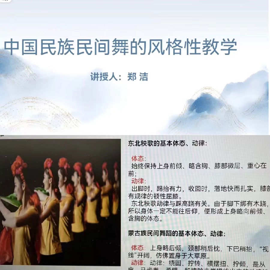 下午,由浙江音乐学院舞蹈系民族民间舞教研室副主任郑洁副教授为大家带来了讲座《中国民族民间的风格性教学》。郑洁老师从藏族、蒙古族、维吾尔族、朝鲜族的民族风格出发,结合民族民间舞教育教学的规范要求,跟大家分享了专业舞蹈的教学经验。虽然大家通过线上聆听讲座,但是也仿佛上了一节专业的实践课程,跟着郑洁老师从藏族的牧区风格组合到朝鲜族的古格里组合,和专业的民族民间舞教学来了一次浪漫的约会。