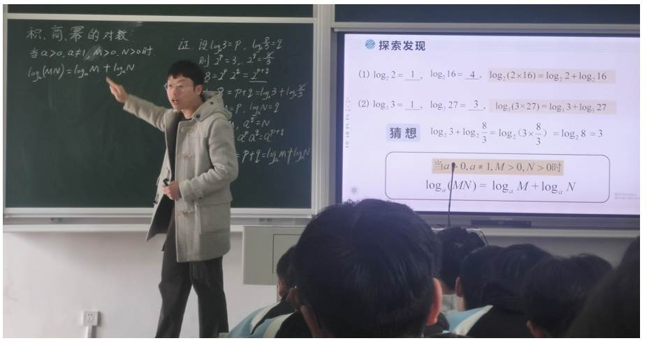 接下来,来自温州市中等职业技术学校的潘健老师带来了《积、商、幂的对数》。潘老师用一题多解的方式,加深学生对对数运算的理解。通过猜想引出公式,借助证明严谨公式,判断对错巩固公式,辅以多种形式呈现的例题变式,熟练运用信息化的教学手段,潘老师对教学内容进行巧妙而独特的设计,充分展示出青年教师的教学风采。