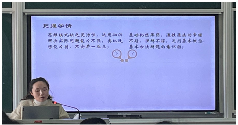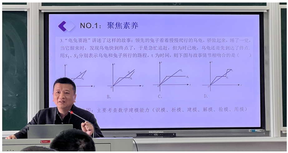 工作室主持人李来国老师基于2022年温州市数学学科素养比赛成绩分析及思考,带来了《聚焦课堂 赋能课堂》的经验交流。李老师详细介绍了本次比赛试卷的命题依据、考试基本情况和学生答题情况。针对存在的主要问题,李老师强调在今后的教学中要重视基础知识的教学,重视实际应用,培养学生一定的数据处理能力,重视思想方法的渗透以及课程思政的融入。提出行之有效的教学策略,为比赛的复习指明方向。