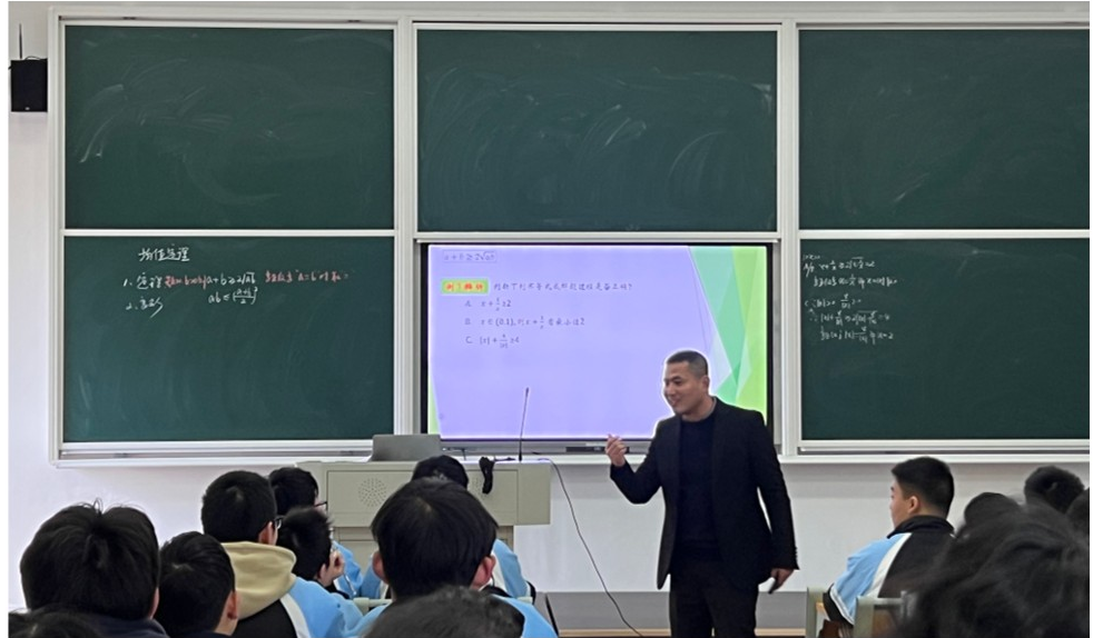 随后,来自龙湾职业技术学校的刘华西老师开出复习课——《均值定理》。刘老师以俄乌战争印象为背景,设置实际问题“哪种购粮方式更划算”导入,引出课题。刘老师通过一次次变形,层层递进让学生认识均值定理适用的不同题型。并总结了“积定和最小,和定积最大”来帮助学生更好地运用知识。例题的渐变,结合刘老师规范的板书演示,详细呈现出了均值定理的方法及形式要求,是一场极美的教学享受。整堂课,刘老师将立德树人的根本任务逐步融入到日常课堂教学中,展示了一堂精彩、高效的复习课。