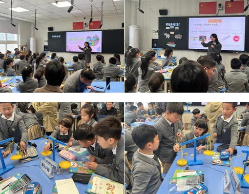 1枚回形针很轻,在电子秤上较难测量。吴老师通过问题驱动,让孩子们想一想、说一说,带着“1枚回形针有多重”的疑问,做了小小设计员与小组同学共同合作,在吴老师的引导下借助天平并通过选取材料、设计过程、调整方案在实践操作中获取了1枚回形针的重量“0.4克”,在活动中切实感受“等量转化”的魅力。