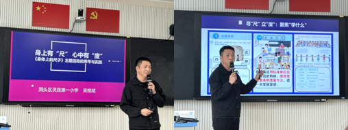 随后,吴维斌老师针对王丽丽老师的《身体上的尺子》展开了《身上有“尺”,心中有“度”》度观点报告。吴老师从寻尺立度、用尺行度、思尺提度这三个方面,从课标、教材和学情两个角度,聚焦了《身体上的尺子》“学什么”。根据课标和教材,吴老师将学生需要学习的内容从素养逻辑、知识逻辑、生活逻辑三个角度进行阐述,强调了量感、单位的重要性。根据学生对于身体尺了解不广、认识不足、测量不准的学情,吴老师提出了本课需要解决的三大问题:1.如何创设真实情景和问题;2.如何划分主题课时和层次;3.如何设置评价纬度和量规。第二部分,为解决上述问题,吴老师向我们阐述了教学设计的三个版本。针对1.0的“步子太小”、“认识身体尺可以不在课堂中集中学习”等问题,重新构思了2.0版本,在实践中发现2.0的“变数过大”、“尺子过多”、“参与不足”,于是重构了今天呈现的3.0版本,将主题活动设置成“1+X”的形式,即1节常规课+X个课余时间。最后吴老师呈现了一个开放式的结尾,在思尺提度的部分中,给众位教师一个思考评价的机会和时间。