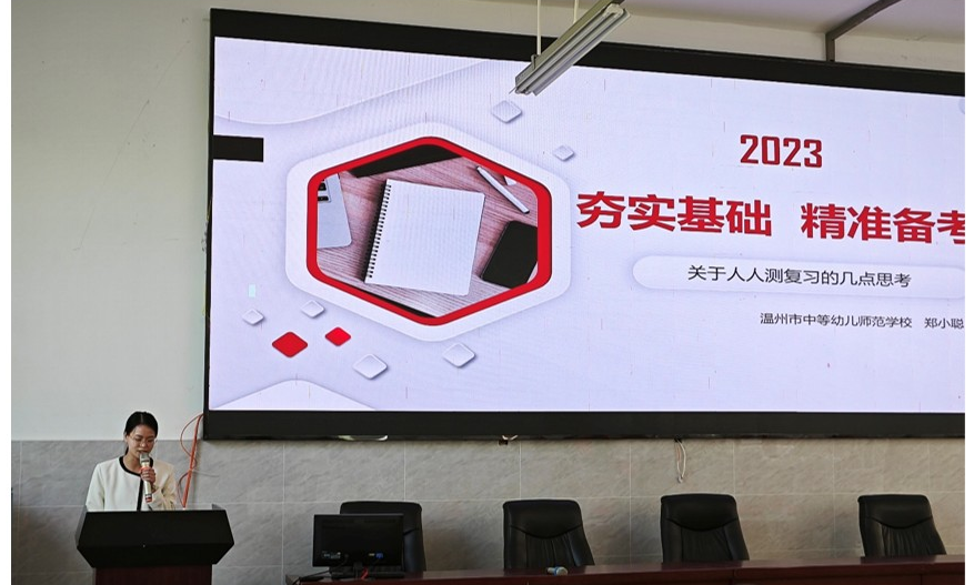 接着,温州市中等幼儿师范学校的郑小聪老师结合自身在人人测复习过程中的经验与大家分享了《夯实基础 精准备考》的策略。郑老师指出要强化学生的问题意识、鼓励学生大胆提问、为学生提供提问契机,是学生最终得以进步的关键所在,同时老师的认真指导、本校领导的支持也是必不可少的条件。