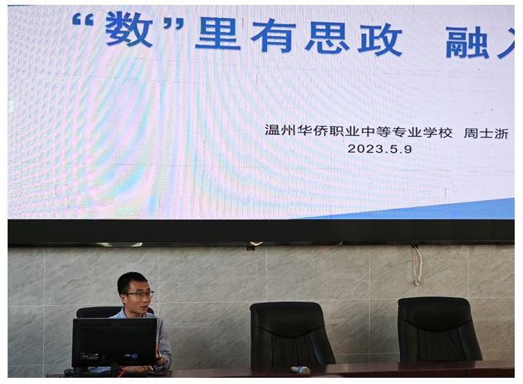 随后,华侨职业中等专业学校周士浙老师开展《“数”里有思政,融合更育人》的讲座。周老师从中职数学课程思政、学校层面开展课程思政实践、一线教师开展数学课程思政的建议三方面进行阐述,给在座教师带来了极具参考价值的中职数学教学实施课程思政的有效途径。