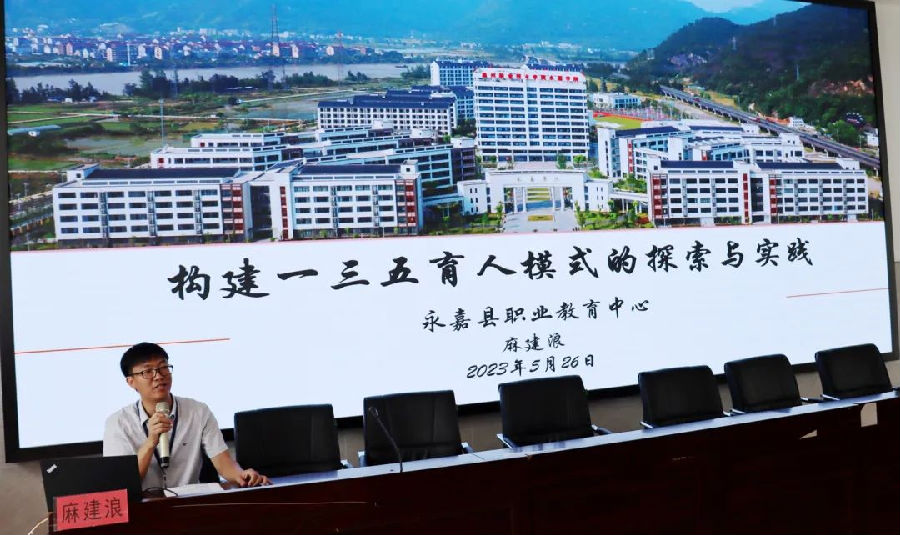 接下来,校领导麻建浪作《构建一三五育人模式的探索与实践》报告,分享了永嘉职教中心的德育经验与特色。