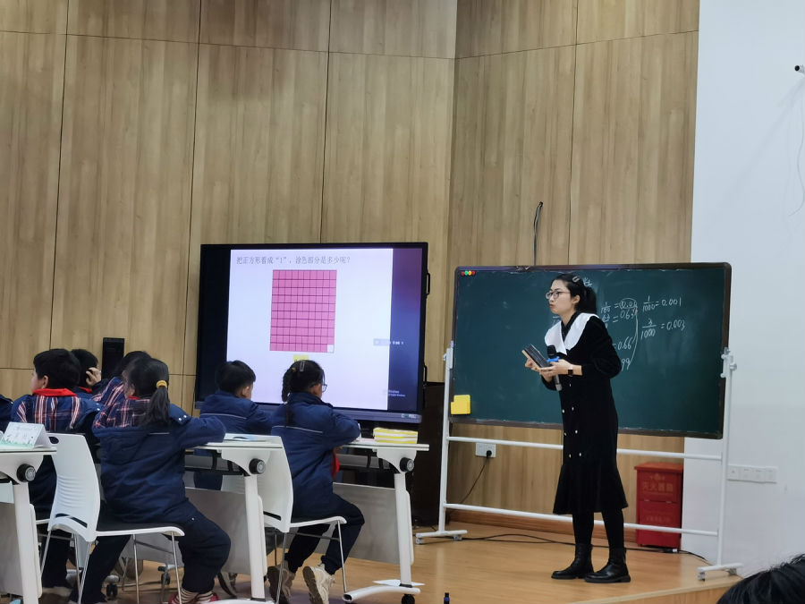 第二节课由东道主柳市镇实验小学候琼琼老师执教四年级《小数的意义》,候老师引领学生通过回忆生活中的小数来激活经验,再借助直观模型,一条线段和一个正方形这样有结构性的材料,让孩子动手探究明白0.1的意义,接着在“冲突”中诞生了两位小数,在推理、联想中产生了三位小数,全课如行云流水,让人享受听课探究学习的过程。