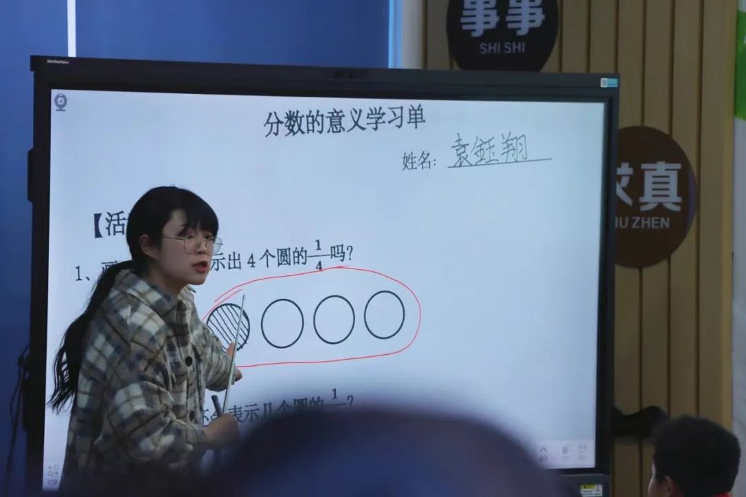 第二节是由李嘉老师带来的同课异构《分数的意义》,李老师从怎么得到一个圆的1/4引入本课,并放手让学生探究还可以怎样表示1/4,在反馈中紧紧抓住把“谁”看成一个整体和“平均分成几份”这两个关键要素,引导学生把一些物体看成“单位1”,平均分成几份。接着,李老师出示已知2个方格是整体的1/4,求整体数量这一活动,并拓展至1/5,1/6,1/7……李老师从“量”的角度培养了学生的数感,紧紧抓住了单位“1”和平均分的教学重点,还巧妙地设计了在12个圆圈中“你还可以找到哪些分数?”这一关键问题,帮助学生在反馈、交流、对比中形成结构化的思维方法。
