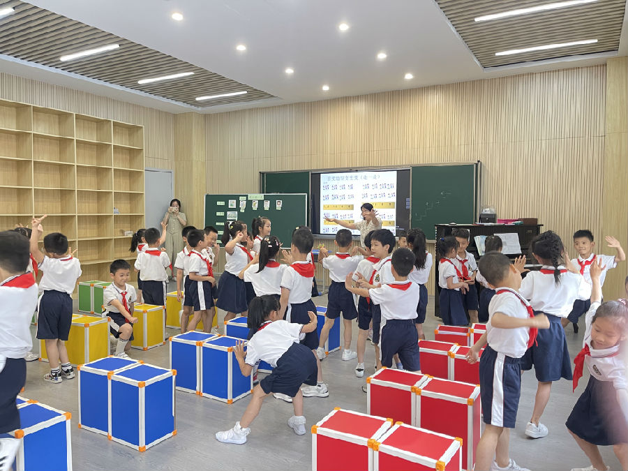 随后温州市百里路小学的赵林丽老师为大家带来了一节生动活泼的律动课《快乐的一天》。在赵老师的引导下,一年级的小朋友在短短的一节课时间里完成了一天生活的律动体验,不知不觉地在律动里体验了舞蹈创编。