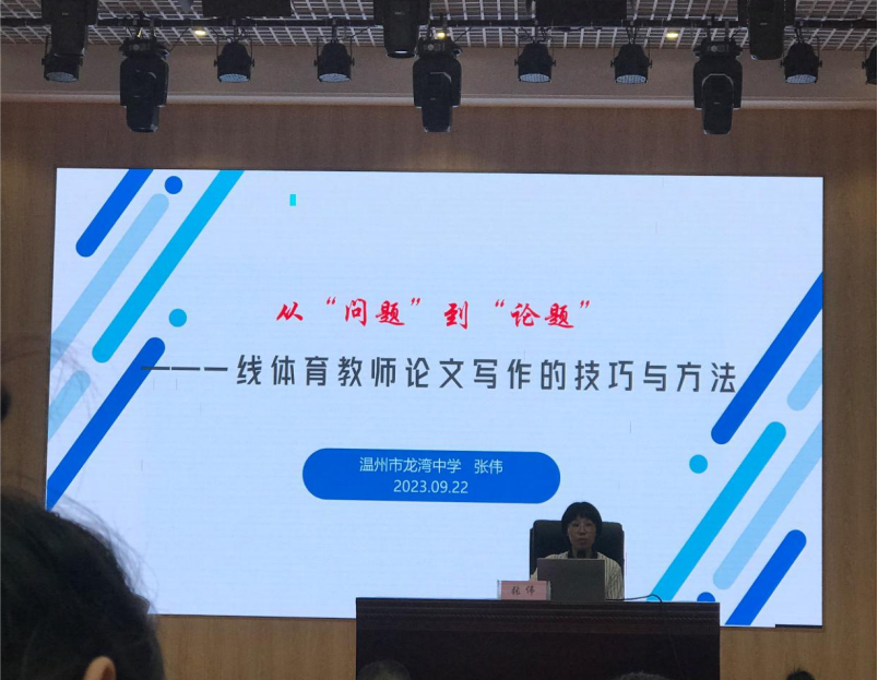 温州市龙湾中学张伟老师从自身状态、自身感受中展开,从“问题”到“论题”总结了一线体育教师论文写作的技巧与方法。从什么是论文写作、为什么进行论文写作、怎么进行论文写作和个人写作反思这四个方面进行阐述。她总结个人写作的七个阶段:出入山门、雾中探寻、略窥门径、苦中作乐、豁然开朗、得心应手、返璞归真,并鼓励一线教师步入科研之路。