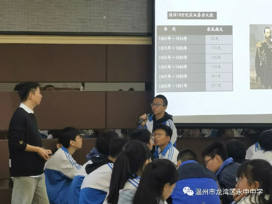 袁若骏老师上《俄国的改革》,以一张17世纪的俄国历史图片导入,让学生找到图中与真实历史不相符的地方,落实学生在生活中运用历史的能力。整节课环环相扣,加深学生对俄国改革的探索与理解。课堂中采用创新性分析报告的形式让学生探究改革对于俄国的意义,营造生本课堂,调动学生参与度。最后再次以导入的历史图片反问学生,课堂设计一气呵成,又从全球史观的角度帮助学生突破论述题的观点撰写,落实课堂评价。