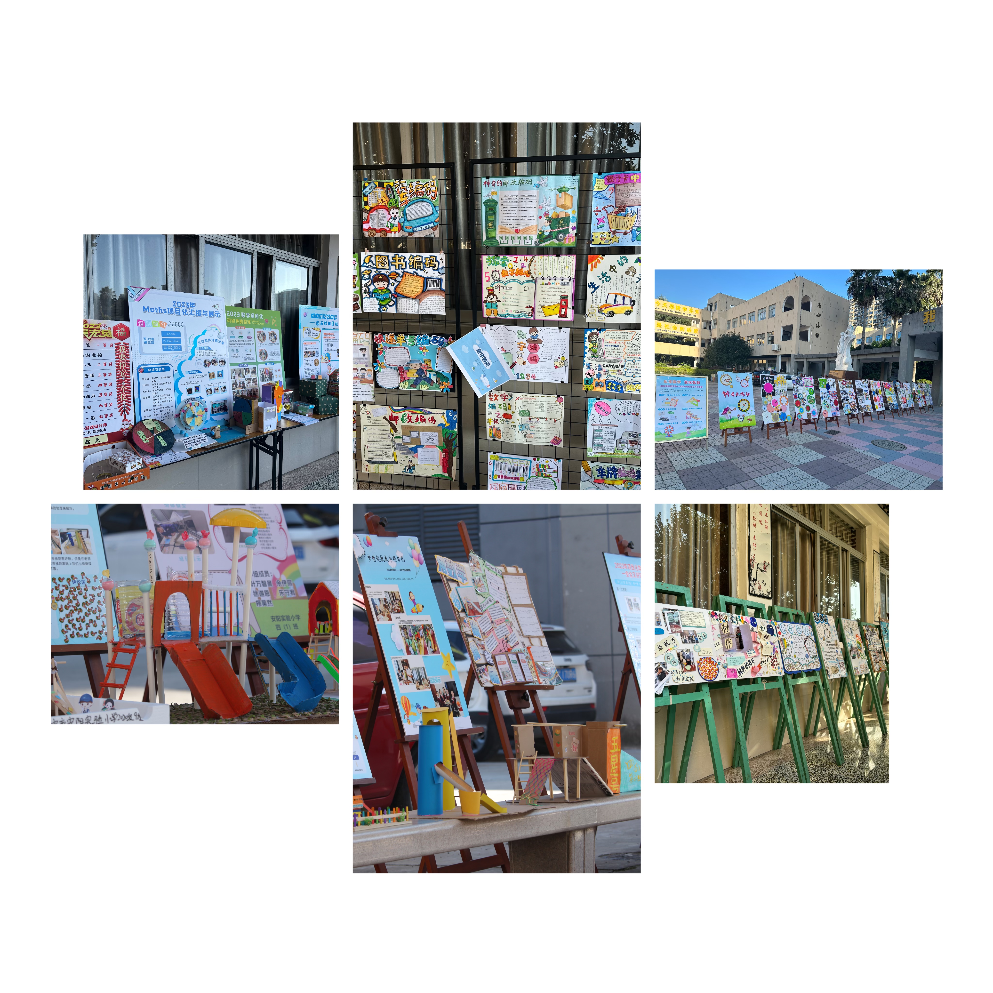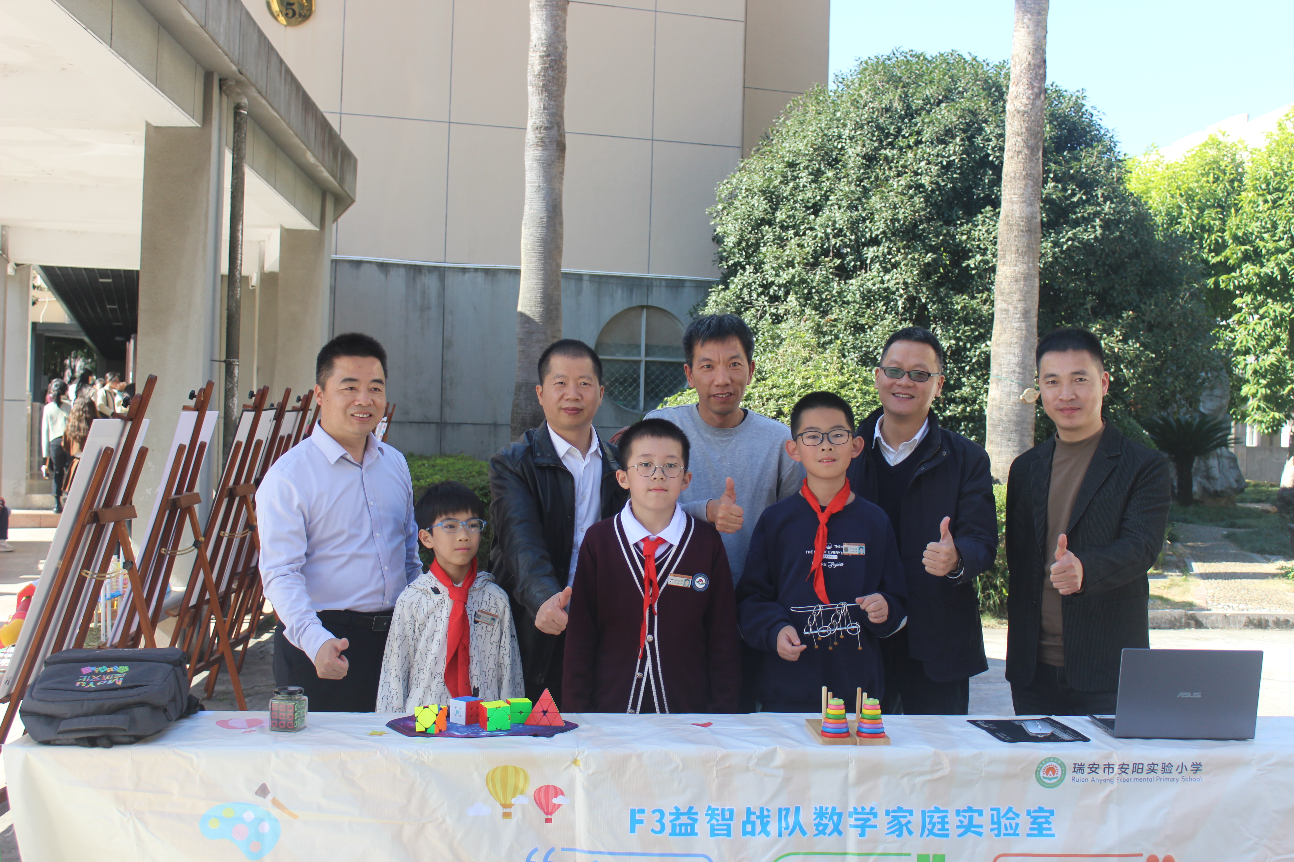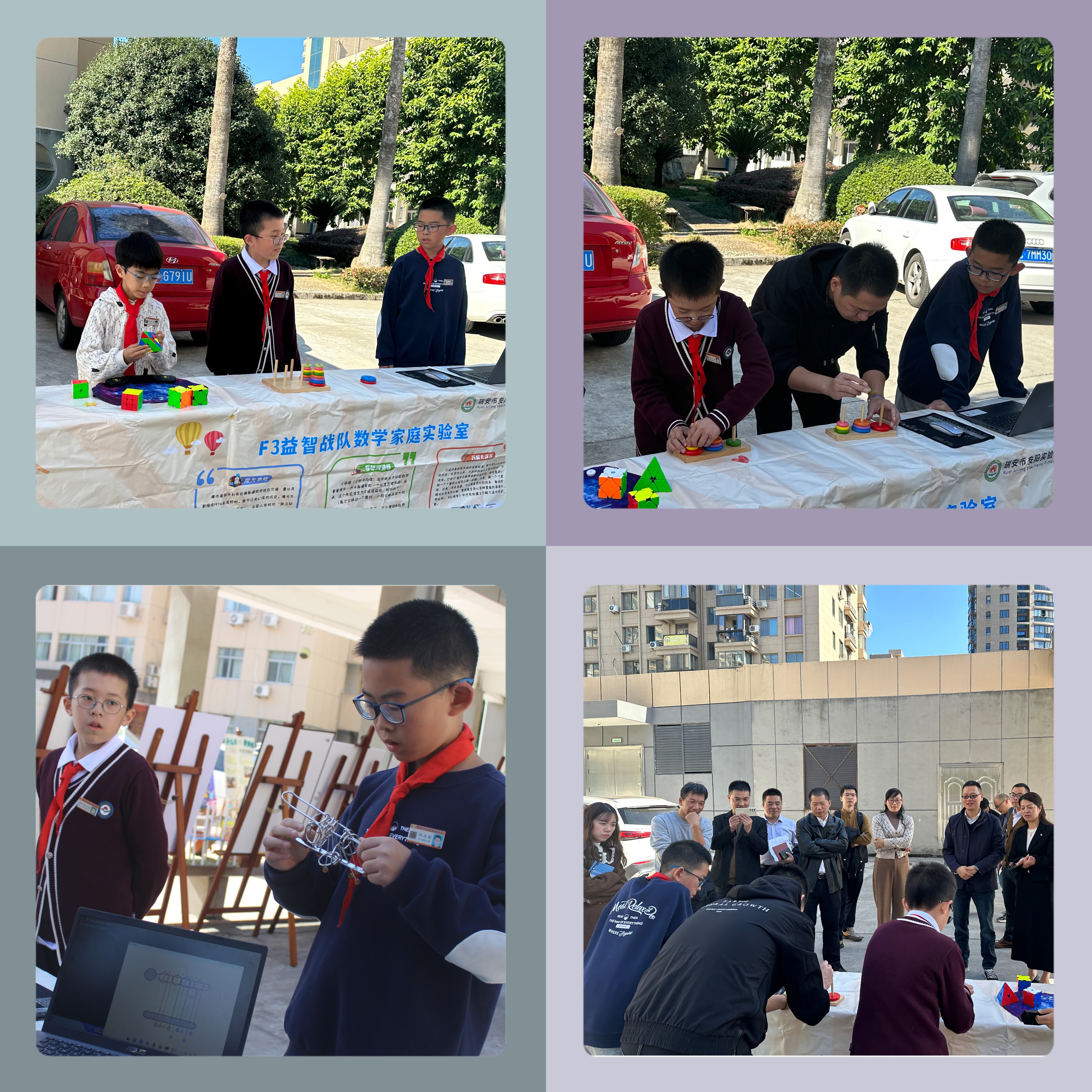 中午,安阳实验小学校长林宝国和张碎莲副校长等人陪同专家一行参观了校数学项目化成果展,欣赏了校益智课程特色展示。陈加仓特级教师和黄静特级教师高度肯定了我校在培养小数学家人才方面的优秀做法,并与参加展示的孩子们合影留念。(图10-12)