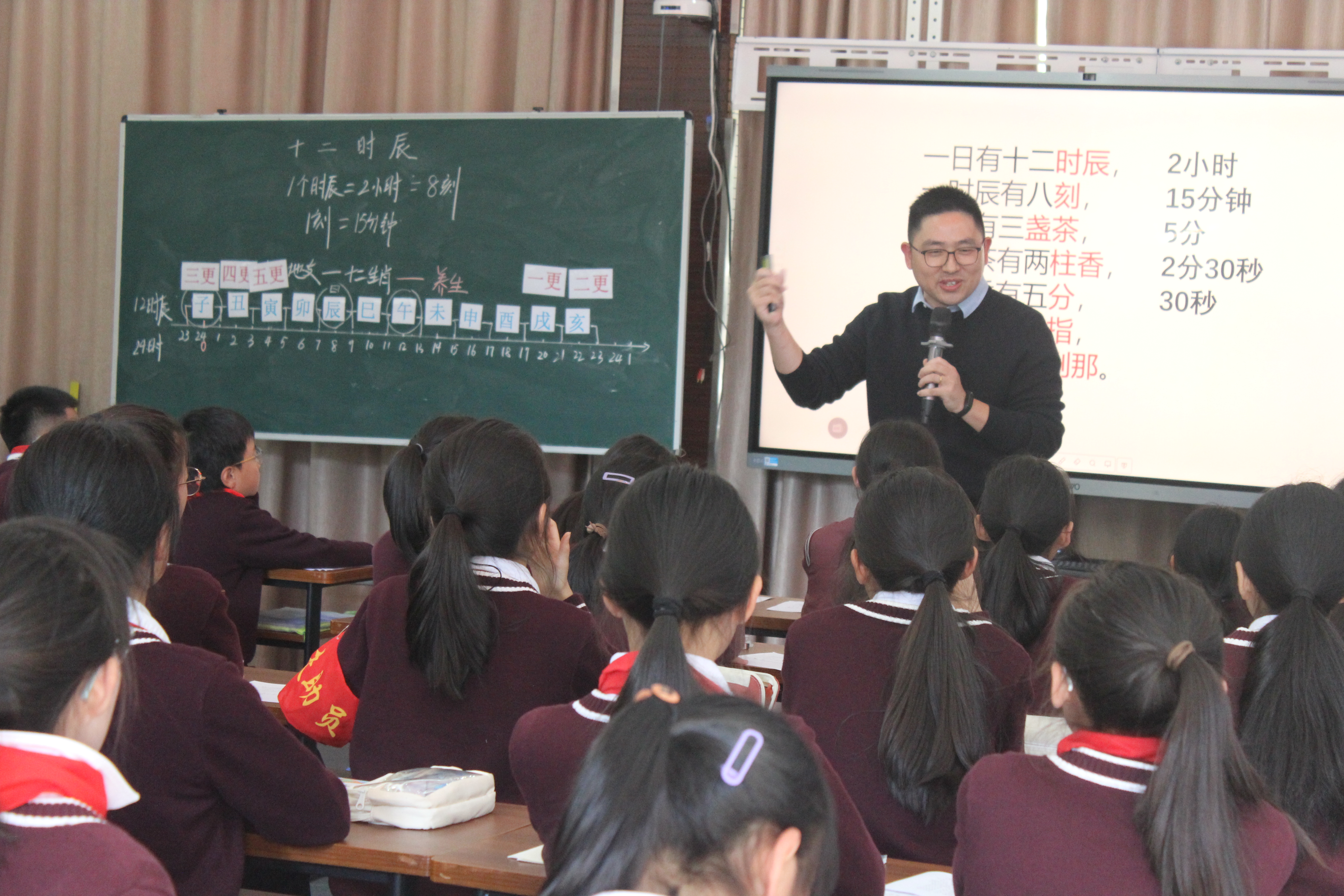 下午第一节课是由来自瓯海区南白象新生小学的伍渊泼校长给大家带来《十二时辰》的精彩课例。伍老师从模拟打更引入,引人入胜。以时间轴为媒介,通过计算、推理、转化等方法沟通十二时辰与24时计时法之间的联系。他还带领学生认识古代不同的时间单位,并进行转化。将生活、诗歌与十二时辰相结合,感悟古代数学文化的独特内涵。(图13、14)