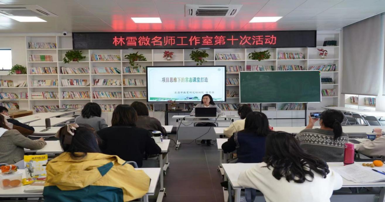 第二环节是专家引领。由省特级教师林雪微老师带来的《项目思维下的常态课堂打造》专题讲座。林老师向学员老师们强调了项目化学习在现有新课标要求以及省中考统一命题导向下的重要性,说明项目化常态课堂的推进能够切实培育学生核心素养,提高课堂教学质量。同时林老师针对当下项目化学习实施的现实困难,提出行之有效的办法。她结合各种课例、课型,用实践经验指导一线教师如何在日常教学中落实项目化课堂。项目思维下的课堂元素如何体现、项目思维下的基本课型、备课思路、课后延伸如何操作,林老师从如何备课到如何教学到课后落实,给名师工作室学员和两校社会教师提供了很好的指引,鼓励大家要一步一个脚印地踏实行进。