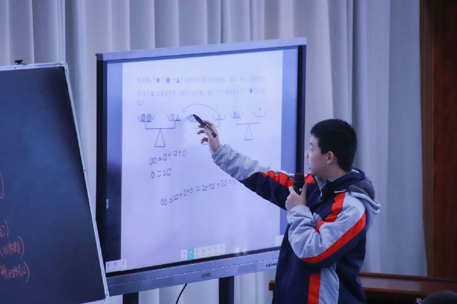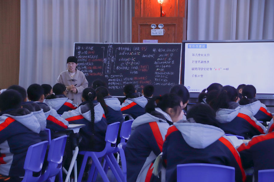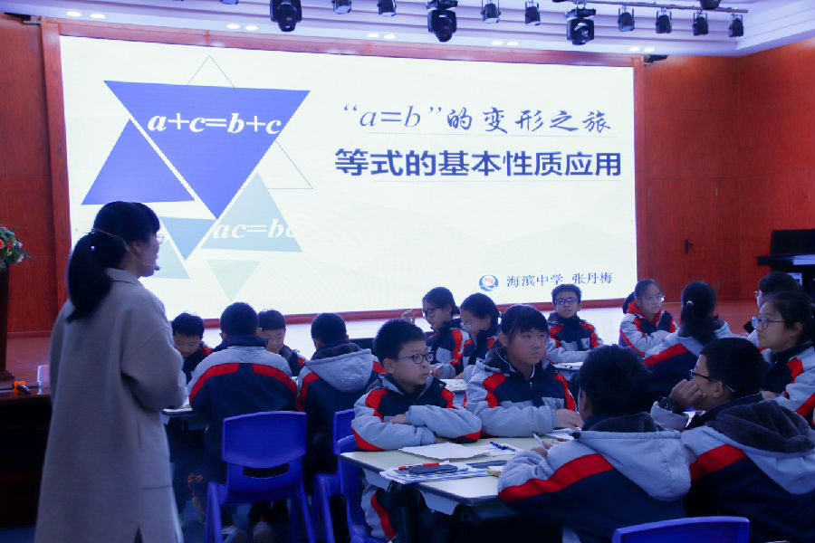 会议伊始,海滨中学张丹梅老师给大家带来一节研讨课《“a=b”的变形之旅——等式的基本性质应用》。课堂上,张老师从让学生写出解为“x=1”的一元一次方程入手,复习了等式的基本性质。然后通过变形利用等式的基本性质解一元一次方程,已知x和y的关系式用含x的代数式表示y,再到说明等式成立的理由,直至最后用等式的基本性质解决实际问题。整节课条理清晰,推理格式书写凸显,带学生完成了等式基本性质的快乐变形之旅。