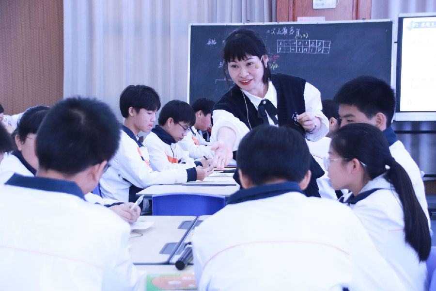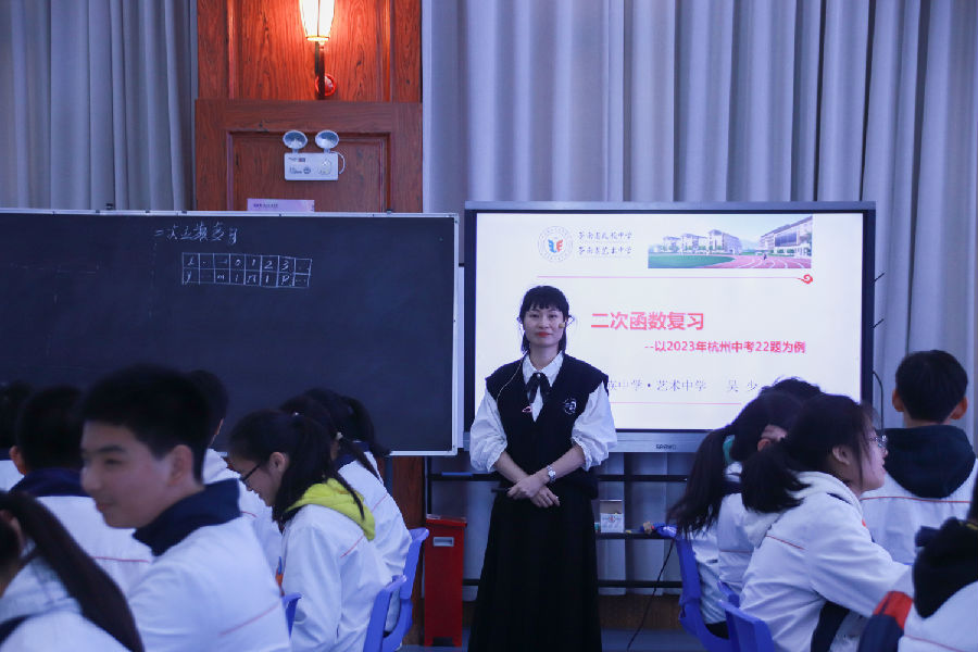 接着,温州市郑银凤“名师送教”工作室学员、苍南县民族学校的吴少春老师带来一堂研讨课《二次函数的综合应用——以杭州市2023年中考题22题为例》。吴老师语言幽默风趣,富有感染力。她从二次函数的表达式及表格信息入手,让学生去获取信息,然后添加条件求二次函数表达式。之后真题还原,学生小组合作,师生共同完成难点的突破。在拓展环节,吴老师对本题进行改编,增加了一次函数和二次函数的交点,并求证不等式成立,让不同的学生有不同的发展,增强了学生的代数推理能力。