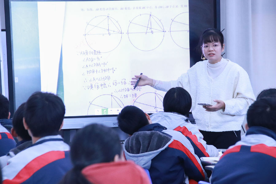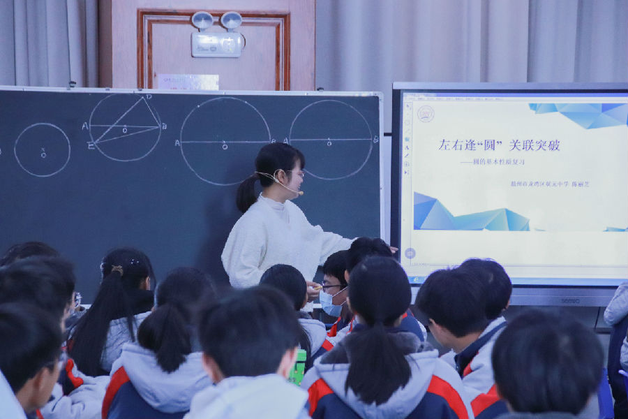 下午的活动首先展示的是温州市钱宜锋名师工作室学员、来自温州外国语学校状元分校陈丽芝老师的研讨课《左右逢“圆”,关联突破——圆周角性质复习》。陈老师抓住孩子对圆爱恨交织的特点,从一个简单题目入手,带孩子们复习了圆周角的性质,并直至本质,圆周角的很多问题都可以通过它所对的弧进行转换解决。然后通过开放与变式,着重培养学生的几何推理能力和书写逻辑,很好地诠释了教师精讲、学生精练的课堂模式。
