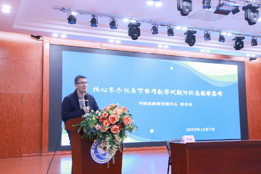 浙江省特级教师、正高级教师、平阳县教师发展中心初中数学教研员张合远老师作题为《核心素养视角下中考数学试题分析及教学启示》讲座。张老师从几何证明、代数推理及由“题”到“课”三个方面进行了精彩引领。在几何证明教学中,张老师从几道中考题出发,结合课例《特殊三角形的再认识》进行了阐述,提到了几何证明教学要重视“利器、优术及明道”。代数推理教学中,张老师结合新课程标准的变化,以《等式的基本性质》为例,在教学中要外显推理过程,让推理的过程“看得见”,设计推理任务,让推理的目标“能达成”,从而发展学生的代数推理能力。由“题”到“课”,张老师重点强调,教师一定要研题,注重设计策略,对题目进行改编与变式,一题多解,多解归一,形成问题解决的策略,从而形成让学生受益的一堂好课。