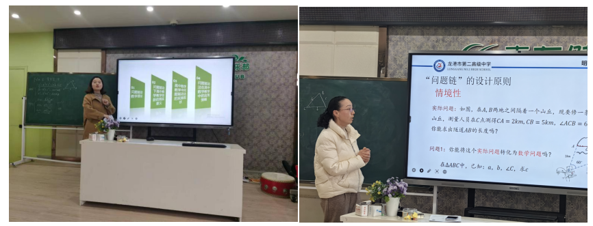 之后国科大附属高中的王珊珊老师和龙港二高的杨彩双老师作了微讲座。王珊珊老师——以问题为驱动,激活高中数学课堂:结合具体的教学实例,从问题驱动教学理论、问题驱动下高中数学教学创新的现实意义、高中数学教学中问题驱动法的实施现状、问题驱动法在高中数学教学中的应用策略四个方面,分享了自己对“问题创设”的理解。杨彩双老师——“问题链”设计与实施:同样也是结合具体的课堂教学实例,分享了“问题链”的设计原则和设计形式的创新的研究心得。