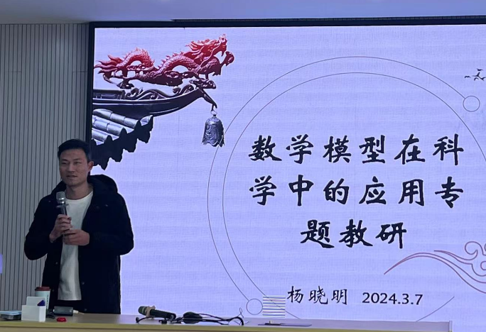 接着,温州市绣山中学教研员杨晓明老师发表了《数学模型在科学中的应用专题教研》,一方面从课堂本身出发,讲述了本节公开课的灵感来源和磨课过程,将本节公开课生成的过程生动地展现在大家面前;另一方面从专业的角度深层次的剖析了模型概念的缘起与应用,将理论与实际相结合,将今天的内容提高到了一个新的层次。