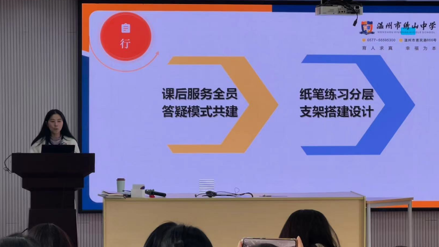 然后,温州市绣山中学九年级备课组长朱婷婷老师就补弱托底策略展开分享,婷婷老师结合备课组实际的经验与做法,围绕如何提高教学效率、优化复习策略、关注学生个体差异等方面,将诸多实用、有效的方法分享给兄弟学校,现场老师无一不感叹绣山中学托底工作的细致与到位。