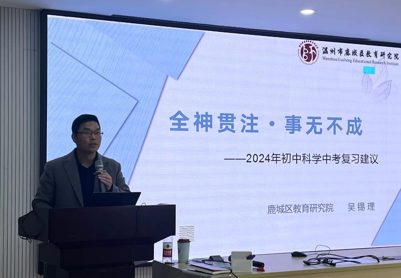 最后,由温州市名师吴锡理老师进行讲座《2024年初中科学中考复习建议》,吴老师立足当下首次省统考的背景,为九年级老师拨开迷雾,明确方向。首先吴老师建议,教师应依托“双减”政策,落实新课程标准,聚焦核心素养培育,强化基础知识教学,同时注重培养学生独立思考和创新能力,为即将到来的中考做好充分准备。其次,吴老师结合实际情况,为大家分析学情,明确问题,利用数据辅助并制定接下来的教学策略。