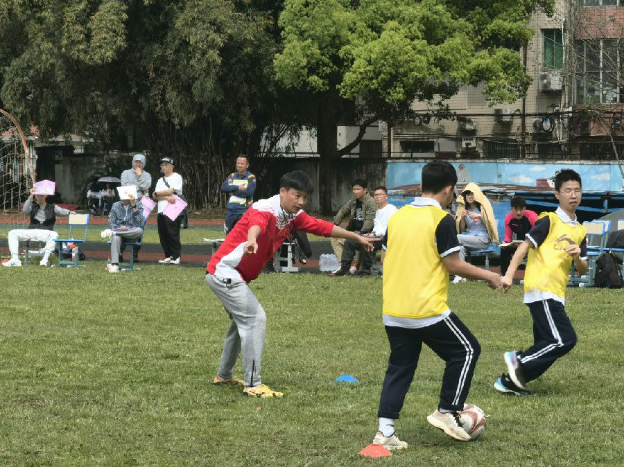 再者由蔡万首老师进行《足球三点包抄战术》说课展示,蔡老师先以娴熟的足球技艺吸引在场体育老师的眼球。他以信息技术为媒介,通过信息技术与课堂教学的融合,清楚明了展示足球三点包抄战术,从而提高教学质量,赢得在场体育老师的热烈掌声。