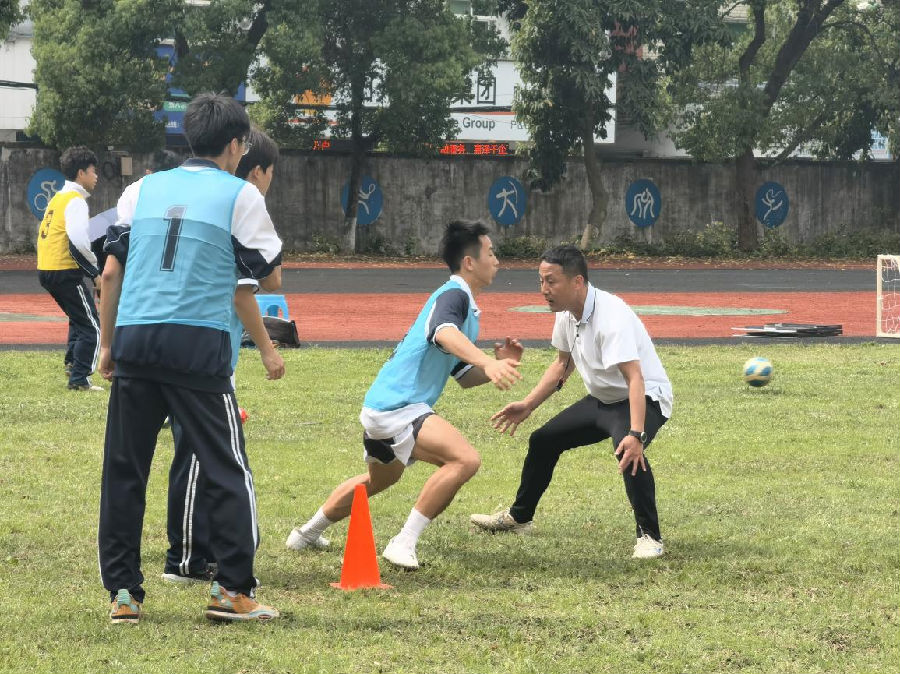 上午第二节课是由温州市第二外国语学校谢作敏老师带来的《足球二人进攻战术方法“二过一”战术》。谢老师将训练方法和教学方式进行融合,体现出专业足球素养。在教学中首先提出“足球的二过一是什么”的问题激发学生学习兴趣,通过讲解示范让学生明白横传直插和直传斜插练习的战术概念和区别。在练习中让学生体会二过一战术中启动、传球、跑动三个运用时机。在比赛中让学生掌握二过一战术要领同时也了解足球比赛的规则。