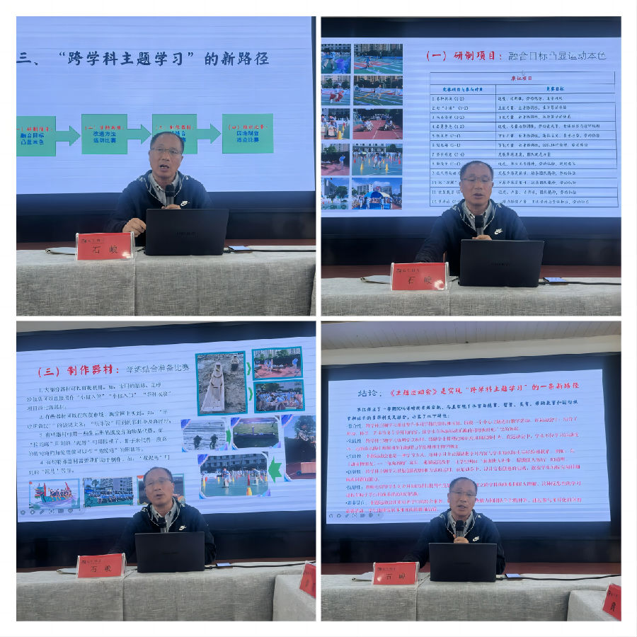 省特级教师石峻老师作《跨学科主题学习的另条路径》专题讲座,他系统地介绍了新课标下,怎样将跨学科主题学习融入体育课堂?从劳动项目的研制、分析项目的共性、项目的器材制作、组织比赛等方面开展详细阐述,介绍了在体育“跨学科主题学习”教学的实践与思考。石老师认为在教学设计中,要清晰项目化的主题,落实到点对点;在实际教学中,要结合场景灵活变通,加深学生对动作技术的掌握。