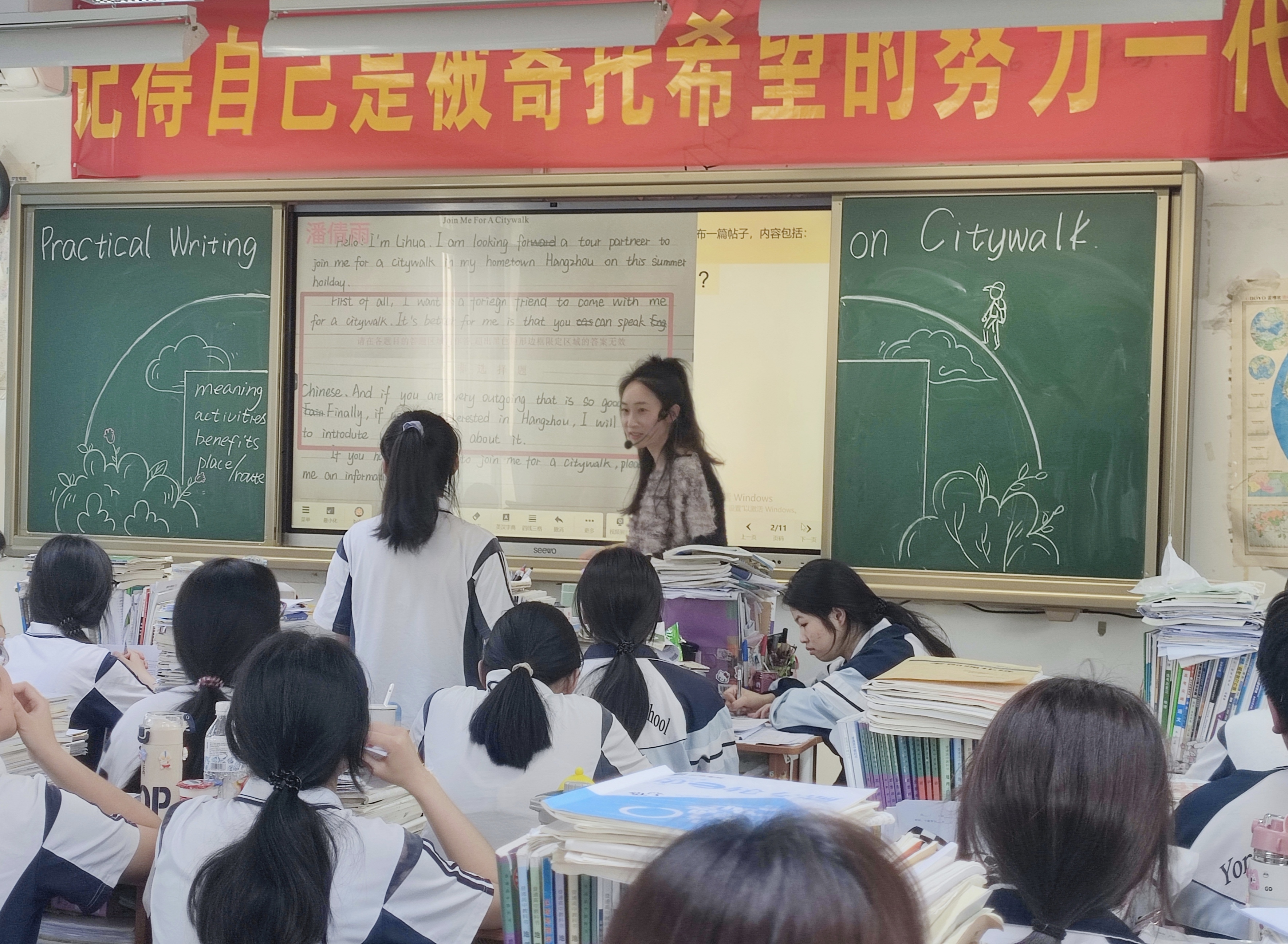 永临中学徐娃娃老师以本次温州二模的应用文题“寻求Citywalk伙伴”为话题,在高三(8)班上了一节《高三英语复习试卷文本二次利用开发》的公开课。徐老师先通过巧妙的板书设计导出Citywalk主题,然后围绕“Citywalk的相关介绍”设计了层层递进的读写活动。学生先运用mind map解读小语篇,提炼出与主题有关的写作素材,搭建内容支架。再回顾新教材中与主题相关的句子,总结出5个介绍旅游地点的句型,搭建语言支架,进行句子仿写操练。最后通过完成“介绍温州Citywalk行程”的段落写作迁移、巩固本课所学。本节课注重对教材的挖掘利用和对写的落实,留给了学生充足的动笔时间,为高三复习提供了值得借鉴的经验。