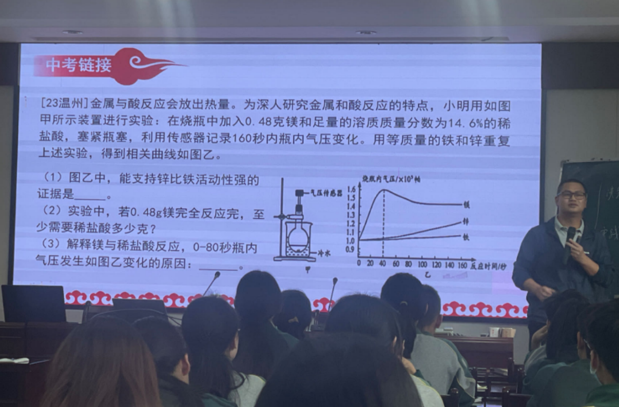 2024年5月9日,温州市蔡呈腾初中科学名师工作室第14次活动在乐清城南中学举行。本次活动先由李鹏、卢建挺老师分别上了一节“一题一课”中考专题复习的课堂展示;工作室主持人蔡呈腾老师结合两位老师的课堂教学做《例谈初中科学“良构试题”变“劣构问题”的教学实践探索》的专题讲座。