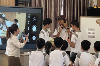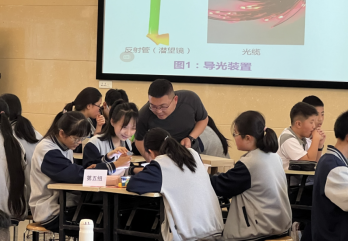 上午第一节课是金卓豪老师开展的《探索暗房自然光采集方案》展示课。这是金老师持续开展的项目迭代课,在此之前学生已经在五一假期中完成了暗房照亮探索的第一次产品设计及效果展示,本节课金老师主要以对第一代产品采集效率不高,导光性不强,以及照明效果不好进行思路设计及新产品的迭代准备,引导学生通过凸透镜,凹面镜,平面镜的综合运用出集光器和照具。再开发新思路,从潜望镜到光缆实验导光对比,说说光缆作为导光器的原理以及更好之处,而且还让学生真实利用光缆将外界光导进教室,非常直观真实。