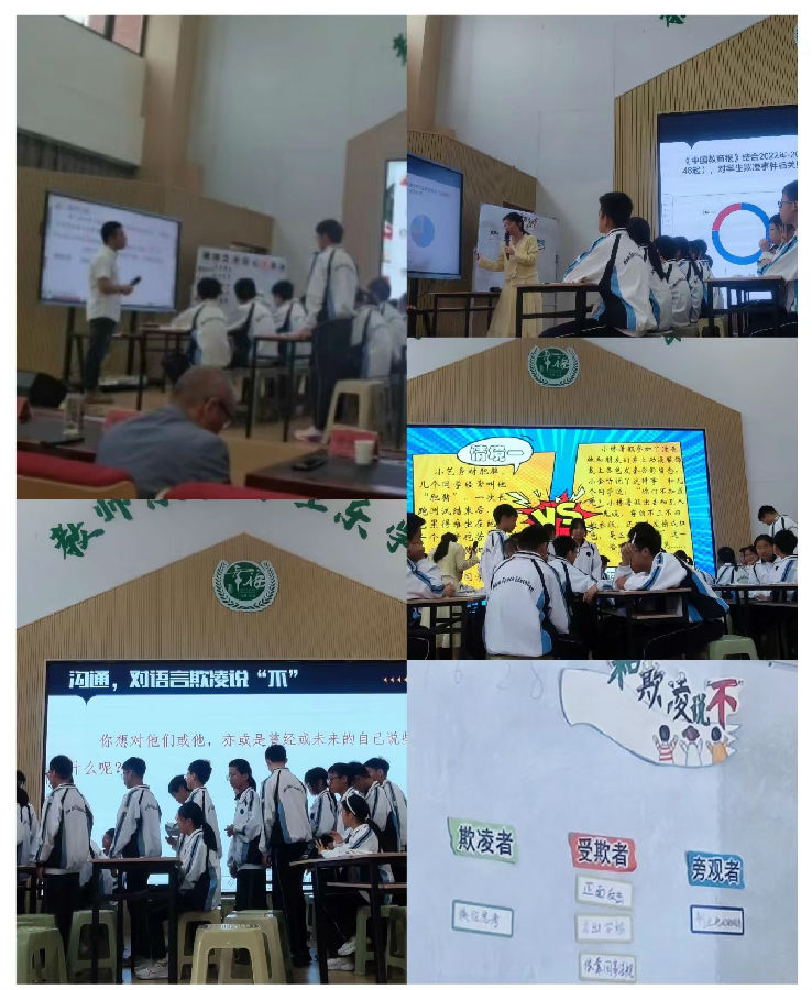 第一个环节:优秀学员吴子健、林小慧两位老师分别带来以“预防欺凌为主题的班会课——《破晓之光:同心拒欺凌》和《沟通——和欺凌说不》。课堂中,两位老师都设置了”校园欺凌“情境,以学生分小组展演、研讨感悟、分享收获等形式让每一位同学亲身体验一把欺凌事件,并引导学生深入了解校园欺凌的严重性,以及正确预防应对的策略和决心,引领学生学会坚决抵制校园欺凌,勇敢沐浴在法治的阳光下,既不做施暴者,也不做受害者。