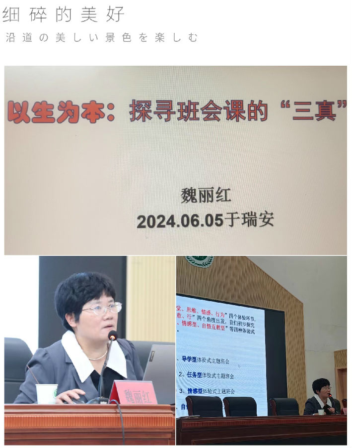 第二个环节:先是专家们在台上做课例点评与专题分享,然后学员代表交流学习心得,最后导师魏丽红做《探寻班会课的”三真“》主题点评。