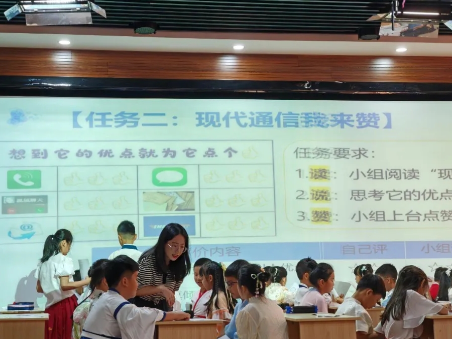 沙城第一小学的方直绵老师带来三下《万里一线牵》一课。课堂伊始,方老师由捎口信游戏激发学生热情,从古代通信站—现代通信站—未来通信站带领孩子云游中国电信博物馆。在场景实践活动与中国百年通信变迁历程中,学生学会自主选择合理的通信方式,感受现代通信的神通广大,提升学生的通信素养,培养学生科技创新精神。