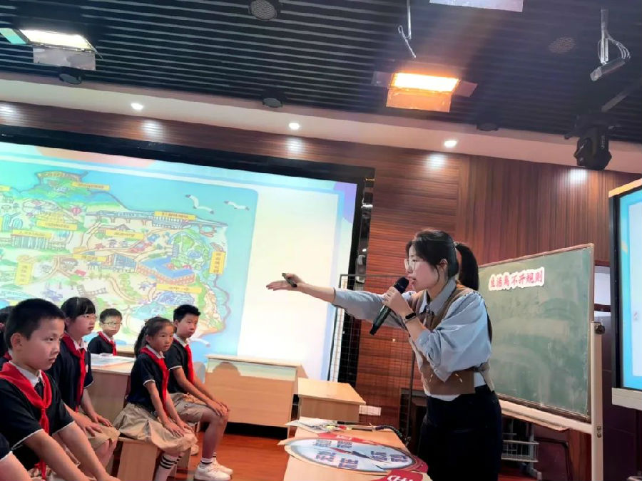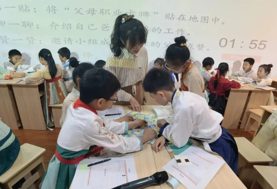 温州湾实验小学的张筱妍老师执教四下《生活离不开他们》,她以学生熟悉的梦多多小镇职业体验为情境,从学校、家庭出发,延伸至社会,上升至国家。借助“小镇地图”寻找身边的劳动者,并通过了解、点赞父母工作,感受身边劳动者的服务保障了社会的有序运转。最后通过探究不同劳动者的故事,推动学生深入体会国家进步依靠广大劳动者辛勤劳动。