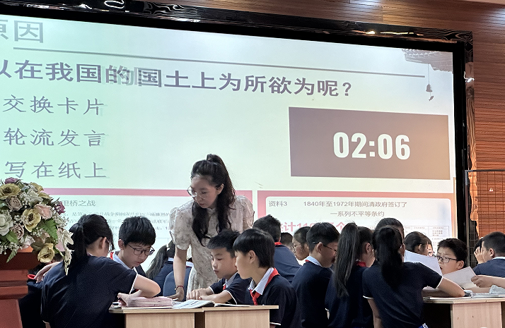 来自天河二小的王霞老师为我们展示五下《不甘屈辱 奋勇抗争》第二课时《圆明园的诉说》。王老师创设“来自龙首的家书”为情境,以“见·圆明园辉煌”、“解·圆明园伤痛”、“辩·重建争议”“听·文物之殇”四个环节开展课堂教学。学生通过小组合作探究、视频资料展示、自由辩论、给流失文物回信等方式,沉浸在情境中,获得了丰富的情感体验,同时也学会理性、全面地看待历史,从而树强国之志、抒报国之情。