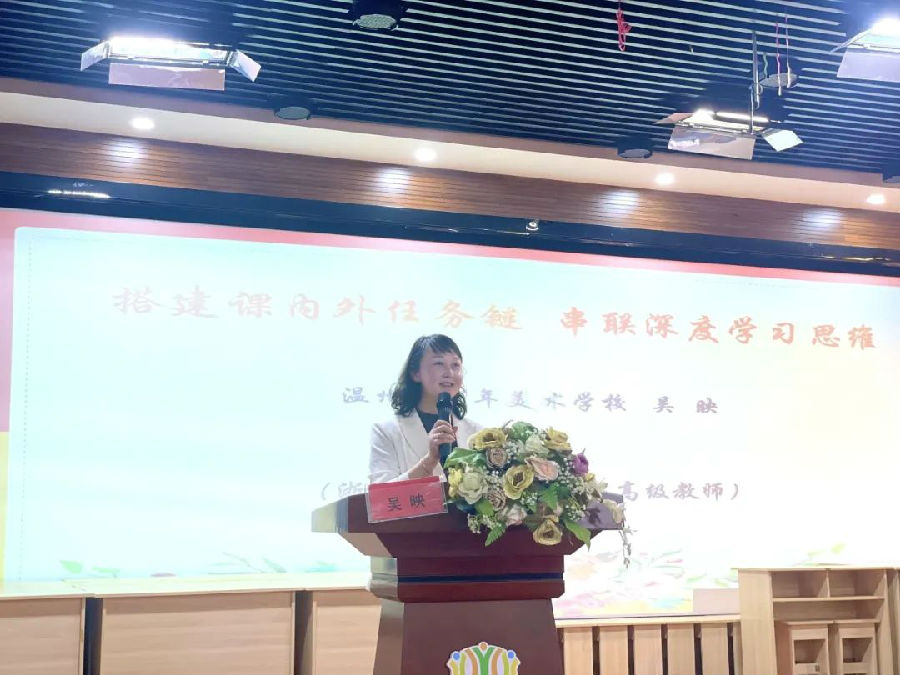 浙江省特级教师、正高级教师吴映老师作《搭建课内外任务链 串联深度学习思维》专题讲座。吴老师立足双新背景,强调了思维能力发展对于培育学生核心素养的重要性。她结合多个优秀案例,从“深耕教材内容,明确主题脉络;整合单元内容,延展教学范围;开展实践活动,深化主题体验;实施综合评价,实现学教评一体”四个方面展开,以单元整体教学为依托,整合单元核心目标和学习内容,根据学情,设计符合学生身心发展规律的学习情境,通过任务链驱动,引发学生深度学习,并联结实践活动和学教评一体化发展,使学生思维力得以进一步提升发展,从而提升学生的核心素养。