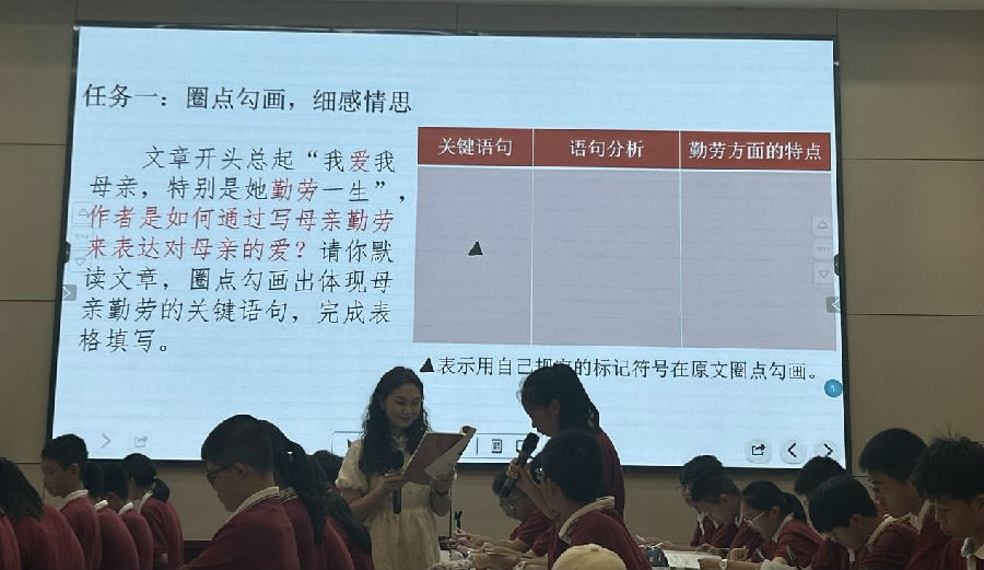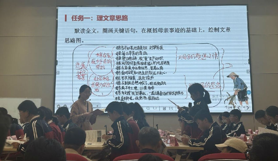 工作室学员李恬田从“学习任务设计是否指向目标设计”这一维度提出,课堂学习任务设计明晰且轻巧。姜倩倩老师则借助回溯时光轴中的“我”和“母亲”,引领学生站在悠长时光中感受母亲带给我的巨大影响。借助灵巧适切的任务驱动,一种温情和感动自然而然地流露出来。