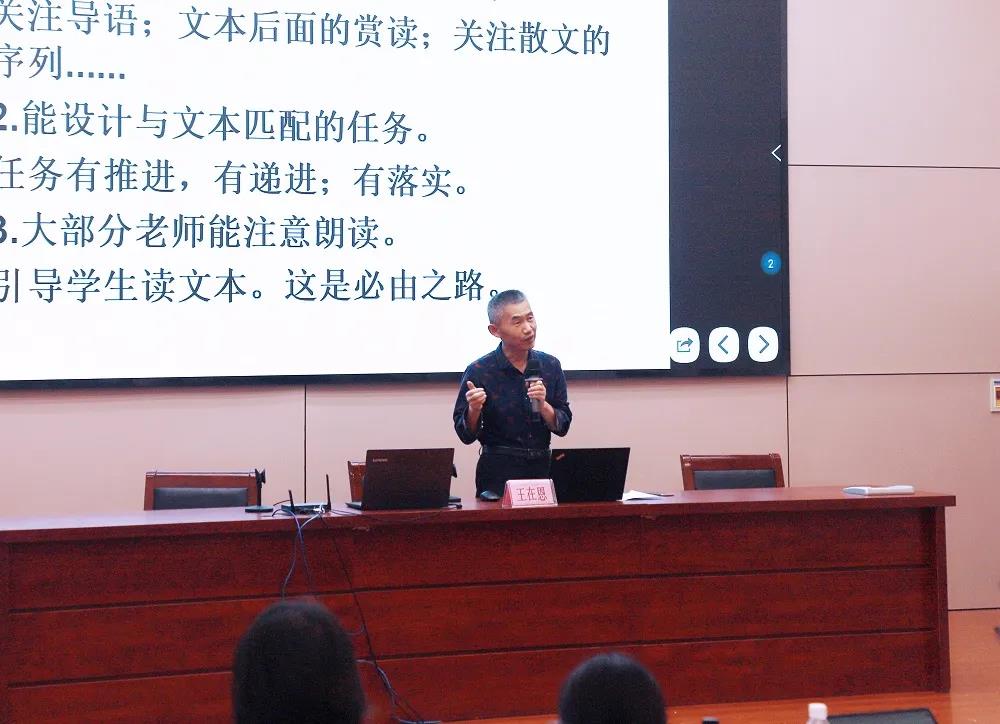 课后点评环节,评审专家对参赛选手的课堂提出了恳切的建议。王在恩老师指出这几堂课的共有优点是关注单元视域下的整体设计,任务的设计具有逻辑性和层次性,还能够通过丰富的教学方法和多样化的课堂互动,提高学生的课堂参与度。同时,王在恩老师认为朗读的指导应该更细致、更深入、更多元化,需要借助朗读直指文本情感核心。