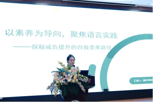 新田园小学林佳佳老师与大家分享《以素养为导向,聚焦语言实践——探秘减负提质的自我变革路径》。林老师依托学校教学分析的系统数据,发现当前课堂教学存在两大问题:一是课堂教学模式传统,以师生对话为主,对象往往是个别学生;二是教师教学方式单一,教师以说为主,缺少对学生思维的深度引导。如何改变课堂模式,让学生做到全员参与,积极思考呢?林老师提出必须在课堂上反复进行“语言实践”,不断创设言语实践活动,提升学生言语实践能力,综合带动语文核心素养的发展。