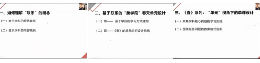 姚老师结合新课标介绍了关于“联系”的大单元教学的思考,围绕音乐的跨界联系和音乐的内部联系,拓宽了大单元教学的概念界限,将不同学段的学生感知体验和表达经验建立联系,将内容之间形成关联,去帮助学生形成学习的一个系统性,启发了我们一种新的大单元视角。随后通过观看课例详细阐述了基于联系的“跨学段”《春天》单元组织设计脉络,基于不同学段的学生对于春的感知、理解、表达和运用的思考以及不同学段的学习方式学习方式的建构,呈现了不同学段,不同的学习方式符合学生的年龄特征,如二年级更多的是模仿,音的反应,发现音乐的奥秘,四年级的发现、创编与合作,五年级的综合、探究并进行一些思辨性的音乐行为探索,从纵向呈现一个递进的过程,促进学生音乐思维的提升。她还强调了《春》系列单元视角下的单课设计,提出了聚焦学科核心内容的学习实践以及围绕任务问题的教案格式创新。