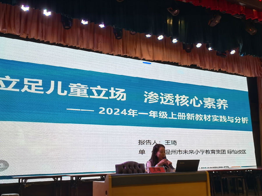 第二项活动,由温州市未来小学教育集团绿洲校区王琦老师作《立足儿童立场 渗透核心素养——2024年一年级上册新教材实践与分析》讲座。王老师以课标的变化方向为指导,深入剖析新教材的核心素养要求。在新旧教材的对比中,解读新教材的特点并提出新教材的变化:单元编排更有结构化,注重知识连续性;幼小衔接更具操作性,重视综合与实践;更注重数学本质的探究;情境更贴近儿童和现实;解决问题更关注过程的思考;学习方式、评价的革新升级等。同时结合自身的教学实践与思考,提出切实可行的教学建议,得到与会老师与专家的高度肯定。