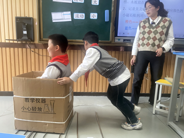 活动伊始,来自苍南县灵溪镇第二小学的瞿潇月老师执教四年级上册《运动和摩擦力》。瞿老师先给学生玩了拉人游戏,一方面活跃了课堂气氛,另一方面很自然的引出本课研究的主题:运动和摩擦力。瞿老师出示了在没有大型机械的古代,人们如何移动重达数十吨重的大石头的劳动画面,引发学生思考:滚动摩擦与滑动摩擦有什么不同?并猜想:滑动摩擦力大,滚动摩擦力小,用轮子代替滚木可以更省力,更方便。进而引导学生自主探究。最后的拓展活动,引入生活中哪些方式是增大,减少摩擦力,以及交通工具如何减少摩擦。