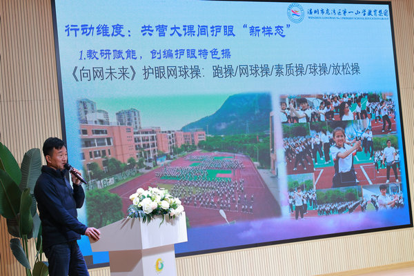 龙湾区第一小学副校长邱飞虎,从空间维度、行动维度、发展维度三大方面作《活力大课间 明眸新视界》的分享。邱校长向大家讲述了学校利用大课间活动打开了亮眼的“新世界”,让每一位孩子爱上运动,让运动成为孩子的一种习惯。
