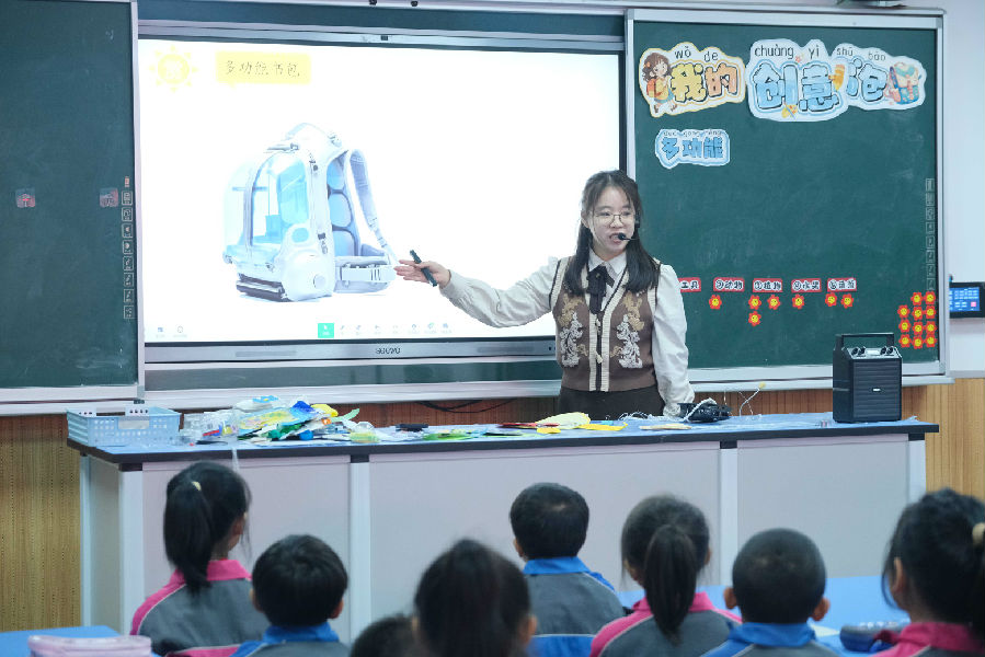 第二节课由苍南县江滨实验小学的曹银施老师带来《我的书包》第二课时研讨课。她在第一课时的基础上深入探究书包的多功能性及与生活的关联,由浅入深引导学生进行头脑风暴激发创意,激发学生的创新思维,调动学生的积极性,采用了多样化的教学方法和手段,巧妙引导学生运用媒材进行创意的设计。