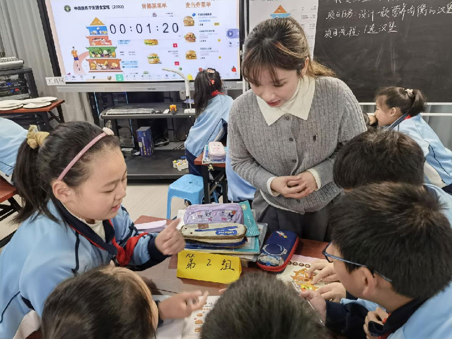 上午,活动在瓯越小学的阶梯教室正式拉开帷幕。首场课堂展示由温州市第二实验小学的郑凤老师带来《膳食宝塔》一课。郑老师通过膳食宝塔与汉堡之间的营养分析与对比,引导孩子们设计和制作健康汉堡,展示汉堡,评价汉堡。通过精心的活动和交流环节,引导学生们深入了解膳食平衡的重要性,课堂氛围热烈而有序